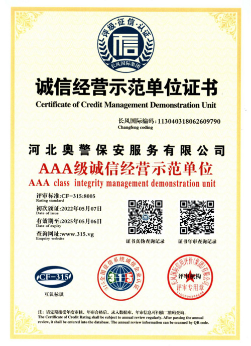“忠誠的伙伴,非凡的朋友”,河北奧警保安服務有限公司本著“客戶的需求就是我們的追求”的服務理念,與廣大客戶攜手并進、共創(chuàng)恢弘偉業(yè)。